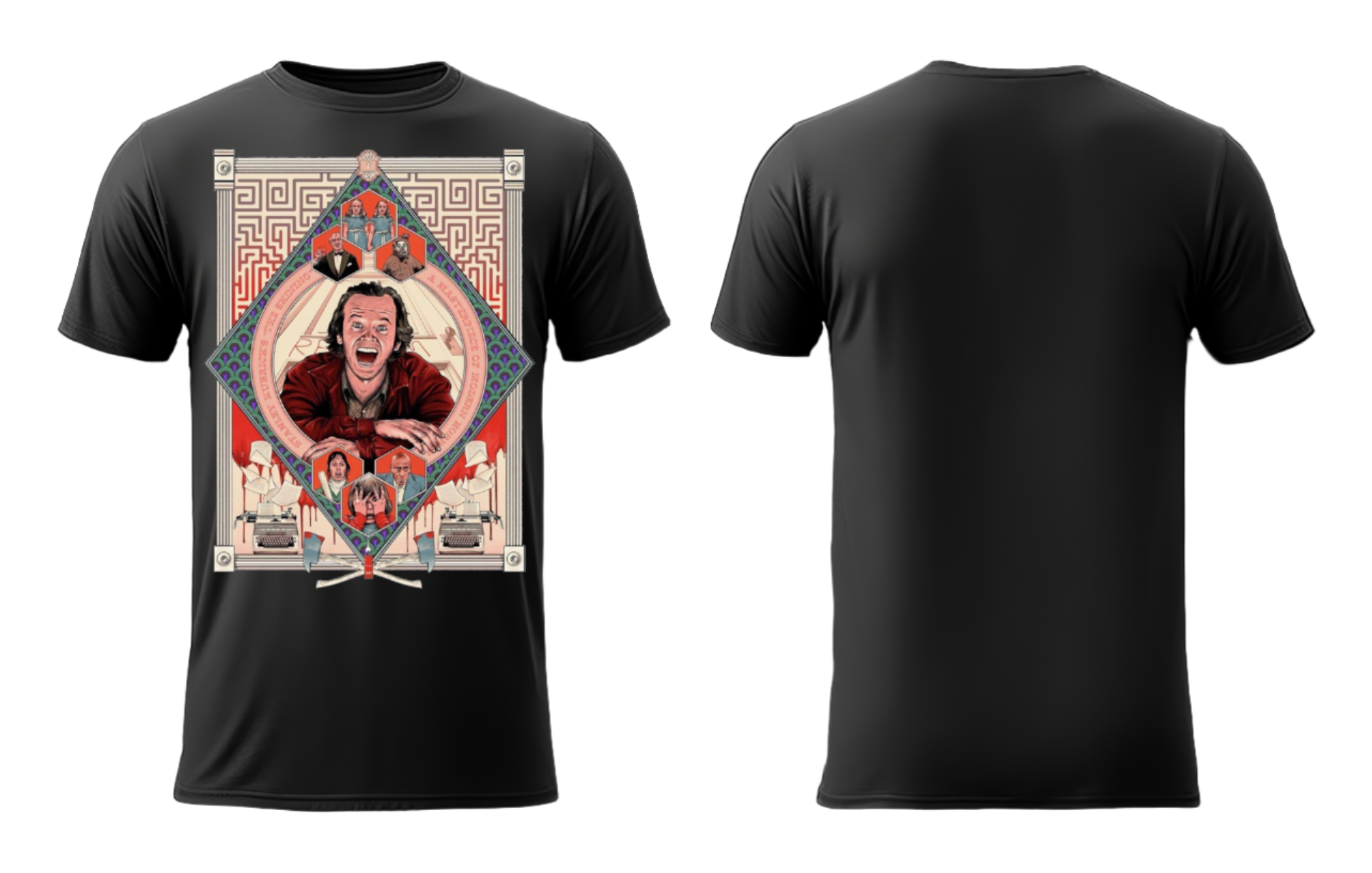Indulge with The Shinning T-shirt art. This exclusive piece features vibrant colors that showcase the amazing artwork from the iconic movie. Own a unique and stylish wearable art piece.